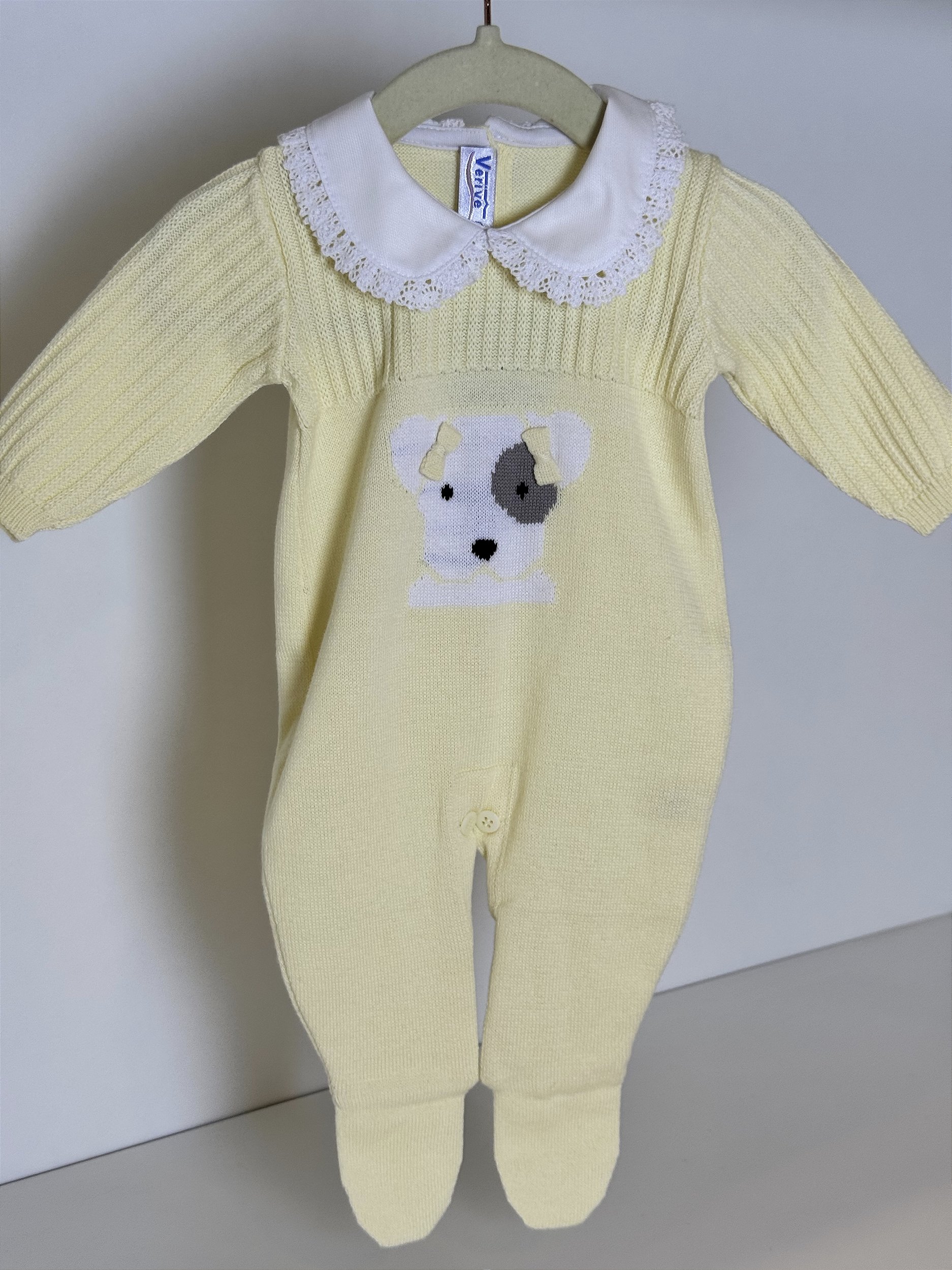 Macacão em tricotil, detalhe em bordado, possui babado na gola.