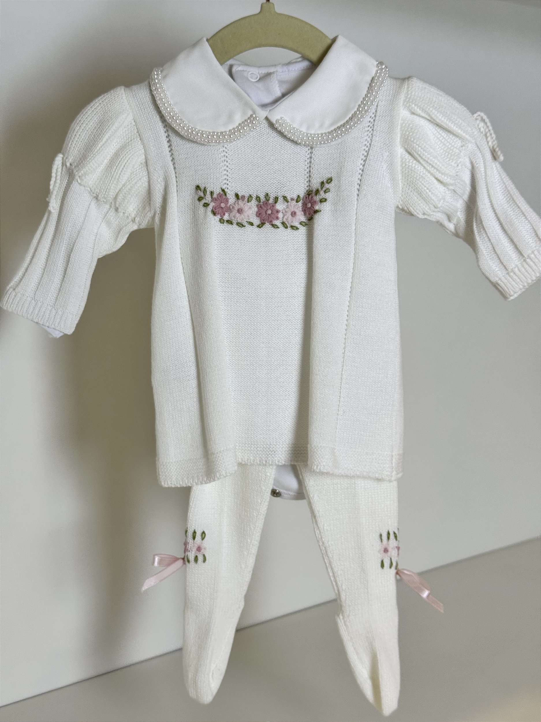 Body 100% algodão com a gola bordada + Vestido em tricotil + Calça em tricotil.